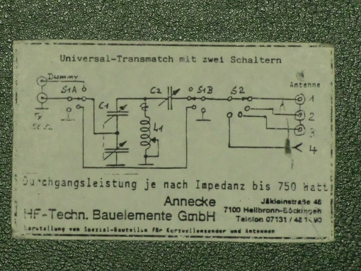 All of the 750w Universal-Transmatch matchboxes as well as the original 300w Universal-Transmatch had this double-capacitor on the 50 Ohm side. Later (modern/current) versions of the Ultimate Transmatch by most other manufacturers no longer use a dual-capacitor. Later versions of the Annecke 300w version also used the single variable capacitor. See more on that on the 300w Universal-Transmatch page.