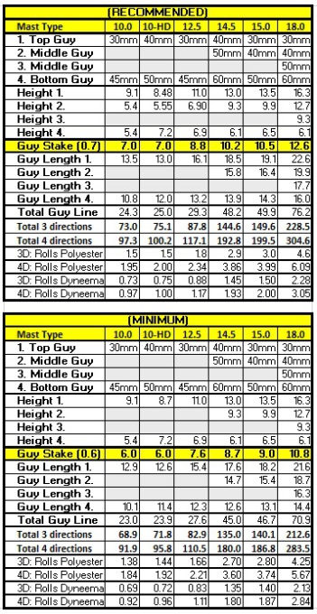 The table on the right shows two sets of lengths for guy ropes.