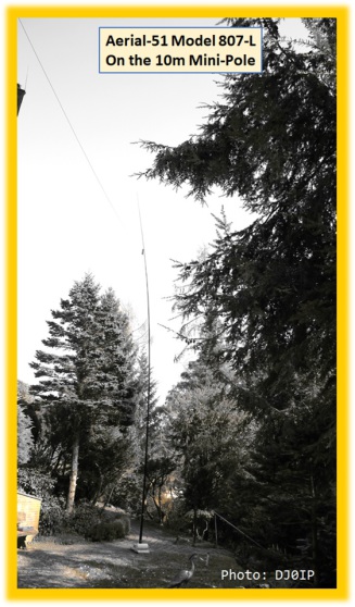 Pictured here is the Aerial-51 "404-UL" 40m OCFD antenna on the 7m Mini. It mounts at the junction of the top two segments. (6.3m (21 ft.) height)